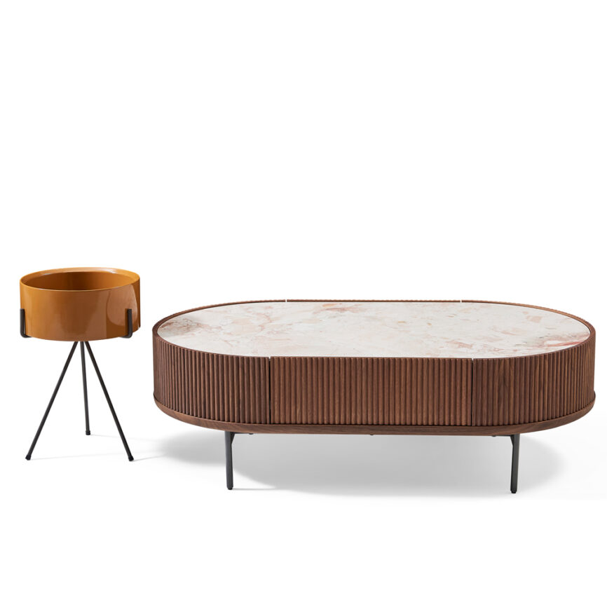 Named after the epic poems of ancient times, Ergo’s Epic Table for GUBI is a sculptural piece of furniture inspired by Greek columns and Roman architecture. Originally made in Italy from travertine stone, the table’s new variant marks the first time GamFratesi has worked with steel plates, which are galvanized, lacquered, and then treated with a series of hand-fin- -finishing processes to create a unique surface expression for each table. The table’s monolithic form remains now, with an industrial expression in which a new detail can be discovered with every use. The collection brings personality to private settings and an intriguing sense of weight and tactility to public and hospitality spaces, whose resilient surfaces offer exceptional durability.