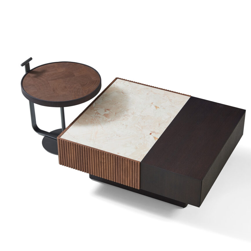Named after the epic poems of ancient times, Ergo’s Epic Table for GUBI is a sculptural piece of furniture inspired by Greek columns and Roman architecture. Originally made in Italy from travertine stone, the table’s new variant marks the first time GamFratesi has worked with steel plates, which are galvanized, lacquered, and then treated with a series of hand-fin- -finishing processes to create a unique surface expression for each table. The table’s monolithic form remains now, with an industrial expression in which a new detail can be discovered with every use. The collection brings personality to private settings and an intriguing sense of weight and tactility to public and hospitality spaces, whose resilient surfaces offer exceptional durability.